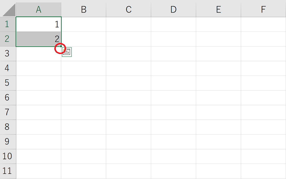 数値が入力されたセルを全部選択してから、赤丸で囲った部分にカーソルを合わせます。