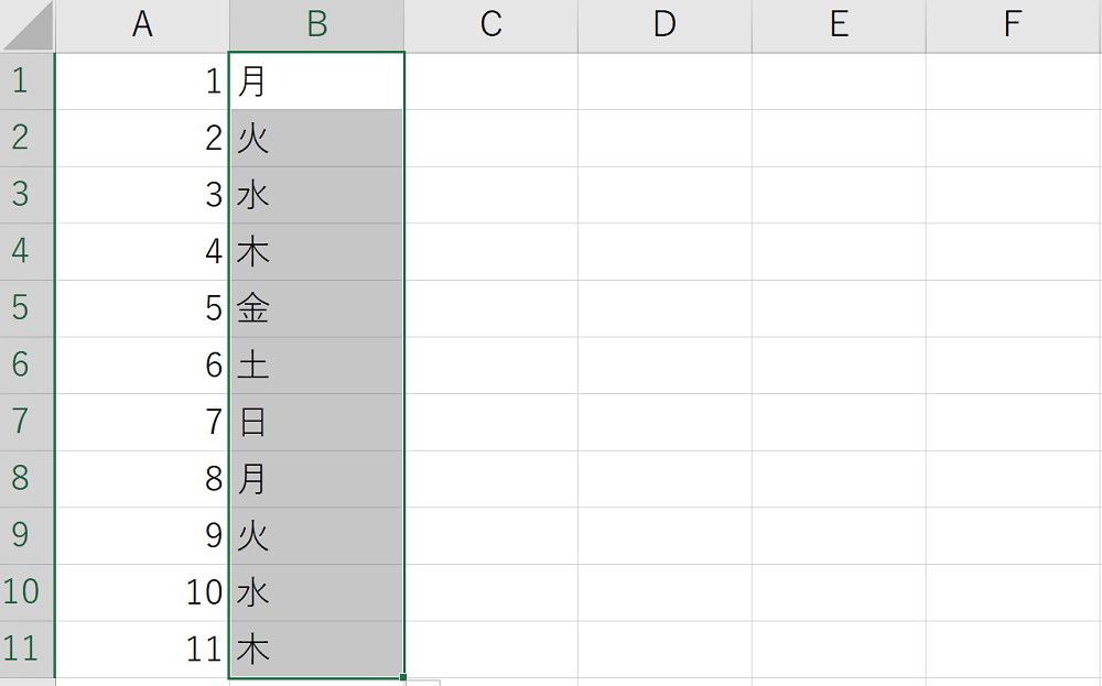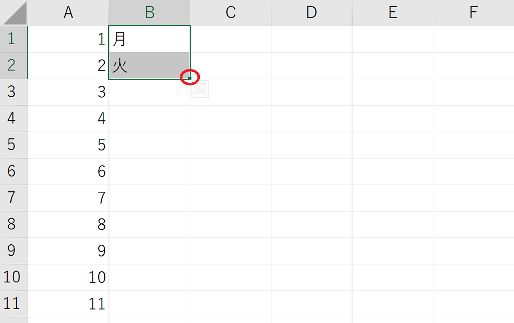 連続する数値や、曜日などを入力する際は、オートフィル機能を使うと一括入力できます。