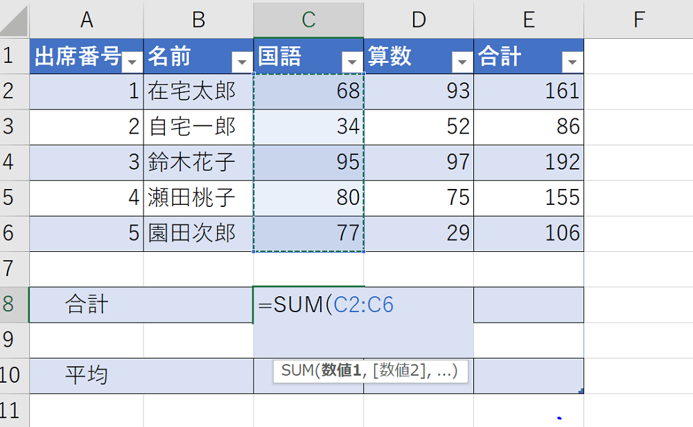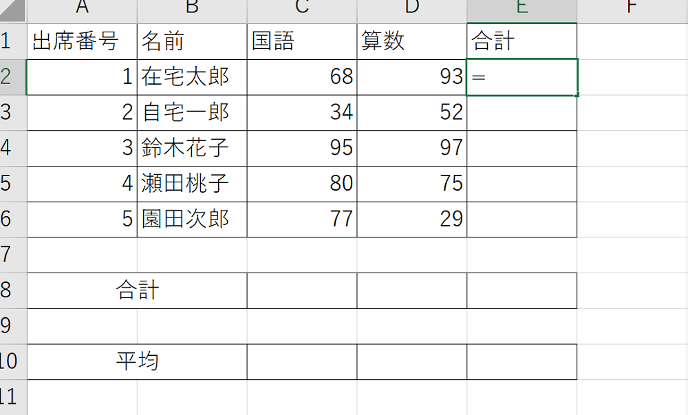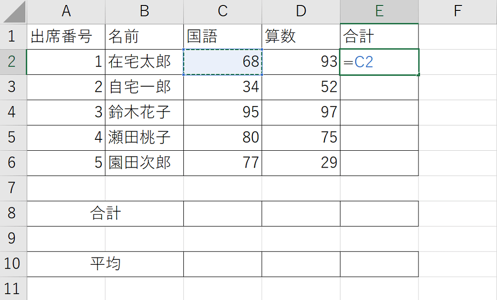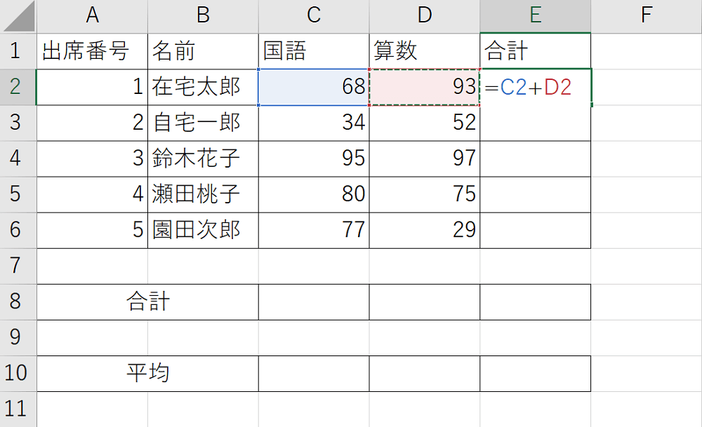 「= C2 + D2 」で、在宅太郎さんの国語の点数と算数の点数を足すという意味になります。