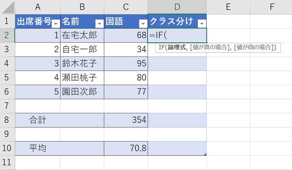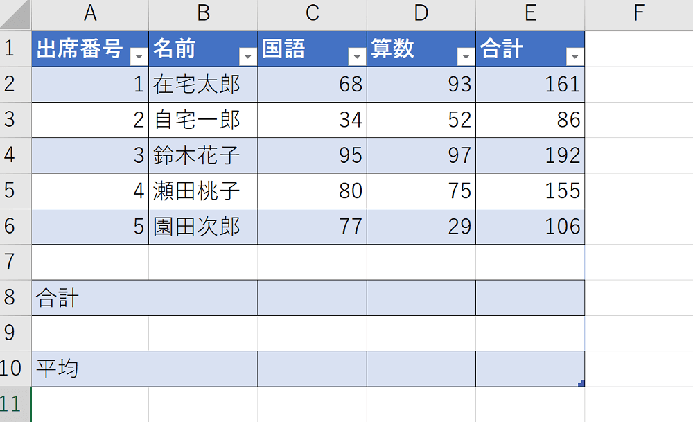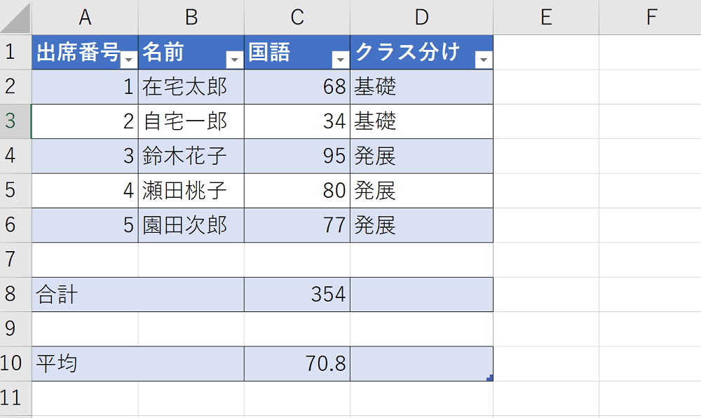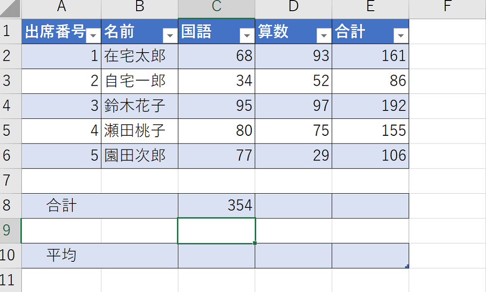 在宅太郎さんの合計点だけでなく、他の生徒全員の合計点まで計算してくれました。