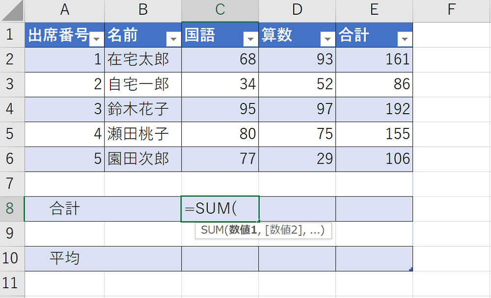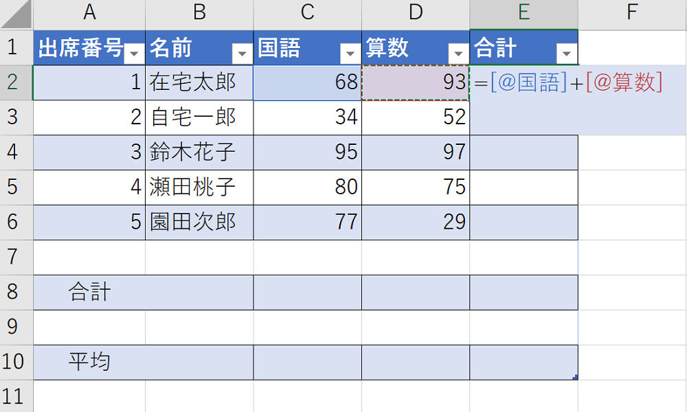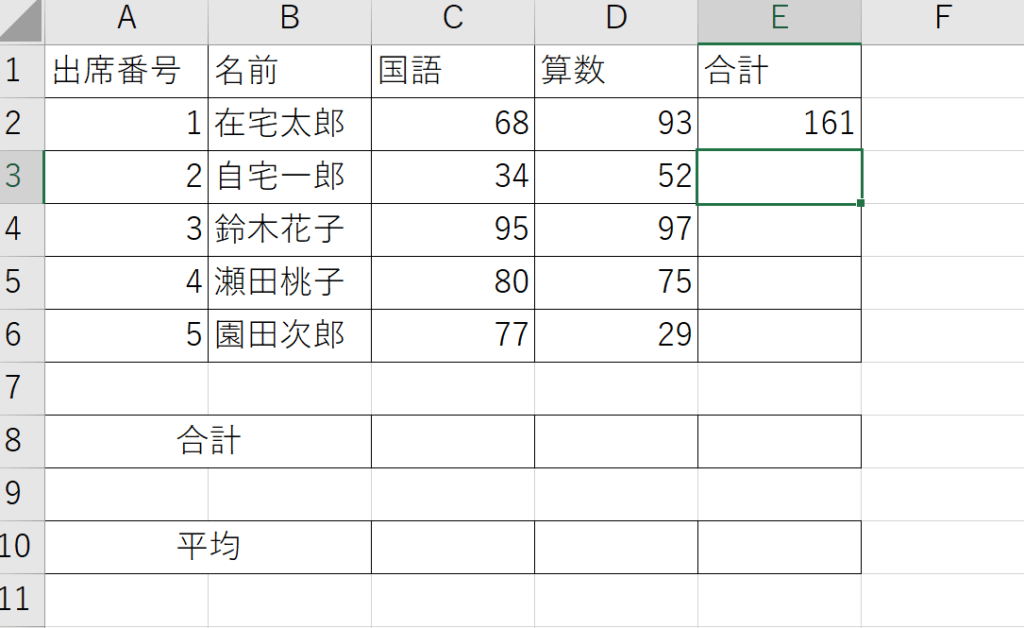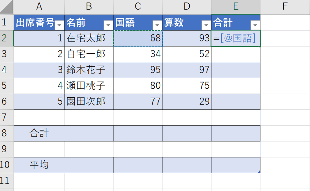 在宅太郎さんの国語と算数の合計点を求めていきたいと思います。