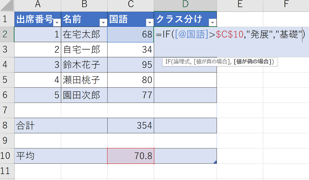 そうならないように、「[@国語]>$C$10 」という書き方をします。