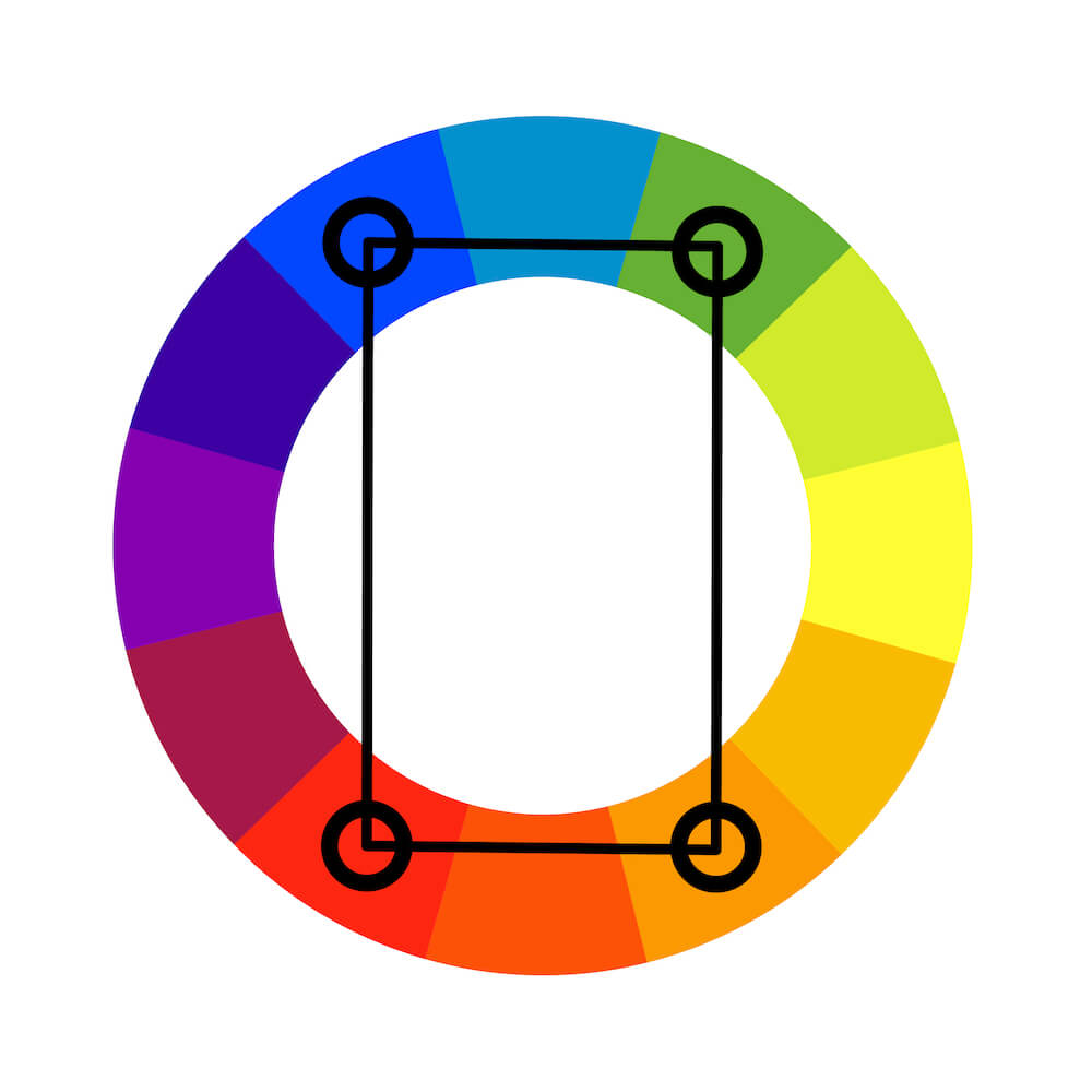 色相環を4等分した位置の色で組み合わせた配色を4色配色と言います。