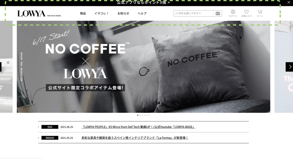 今回例に出したホームページでは、まず最初に今最も注目のキャンペーン内容に目が行き、