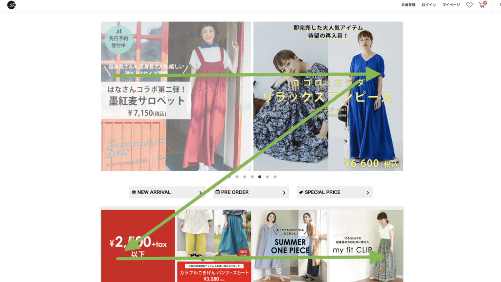 このように大切な要素をZ型にレイアウトすることでユーザーの興味を引き立たせるように見せていく手法です。