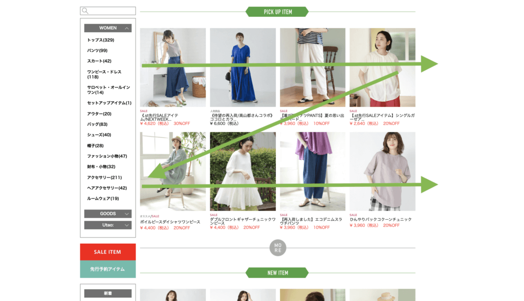 このように左上と右下は最初と最後にしっかりとユーザーが見てくれる場所であるため、見て欲しい重要な要素を置くのに適しています。