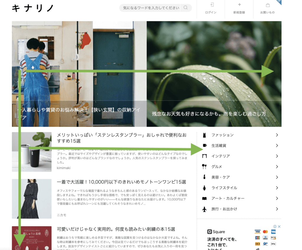 その際、ブログ記事のサムネイルを見た流れで、タイトルと本文一部を見るというように、横へも視線が誘導されていきます。
